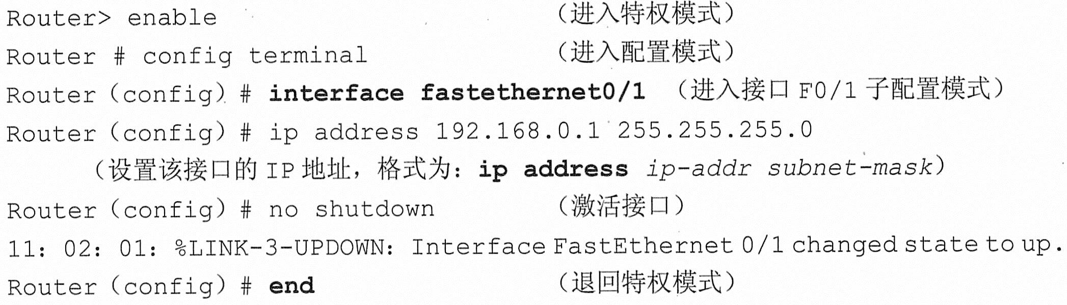 (2)接口基本配置:在Cisco路由器通常是模块化的,每个模块都有一些相应的接口,例如以太网口、快速以太网口、串行口(Serial,即广域网口)等。与交换机不同,它们在默认情况下关闭的,需要人为启动它。