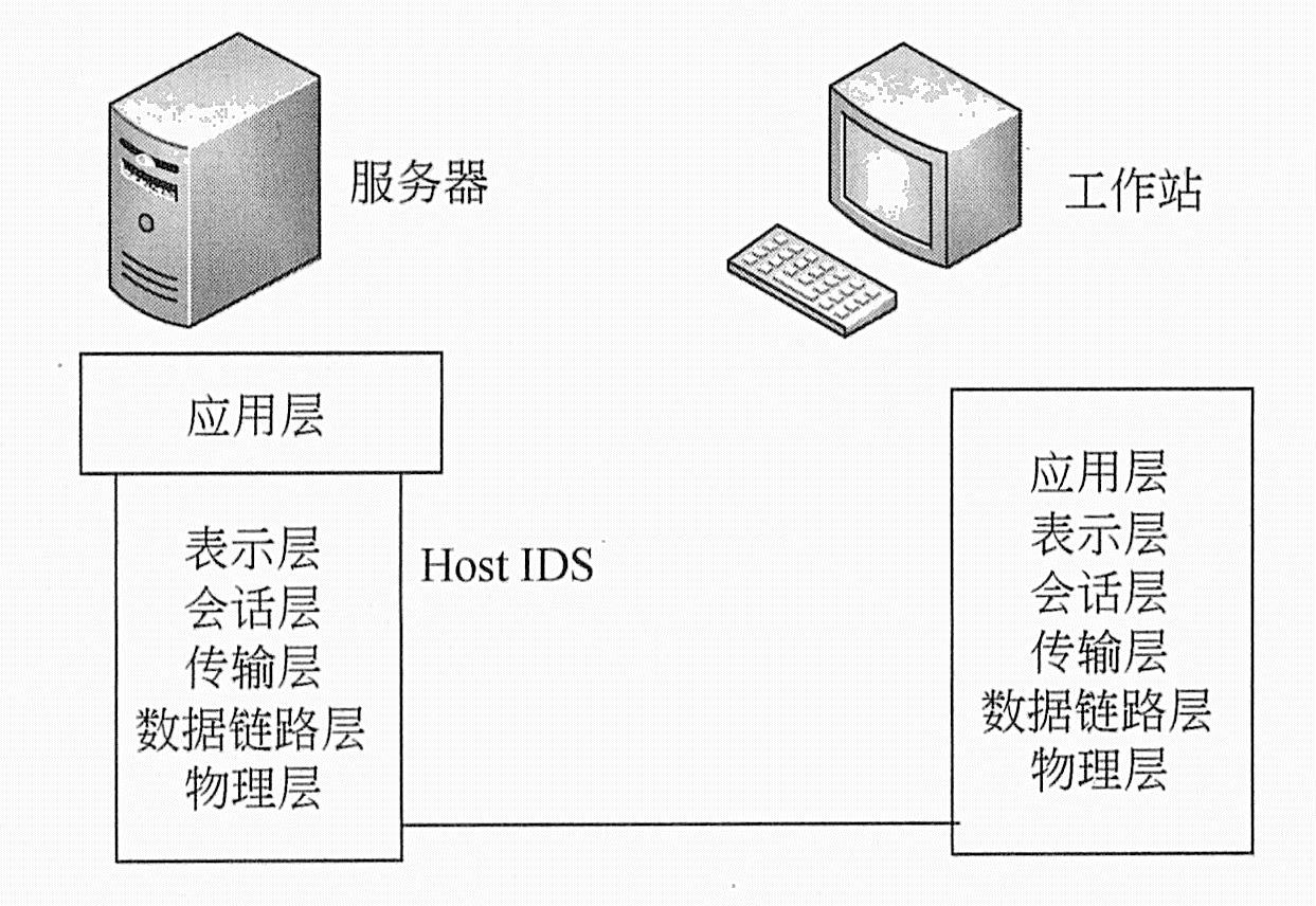 基于主机IDS的检测目标是主机系统和系统本地用户,原理是根据主机的审计数据和系统日志发现可疑事件。该系统通常运行在被监测的主机或服务器上,实时检测主机安全性方面诸如操作系统日志文件、审核日志文件、应用程序日志文件等的情况,其效果依赖于数据的准确性以及安全事件的定义。可见这种类型的IDS是利用主机操作系统及应用程序的审核踪迹作为输入的主要数据源来检测入侵。基于主机的IDS被设计成检测IDS代理所驻留的宿主机,如下图所示,这种IDS可以检测到网络协议栈的高层数据,也可检测到被监视主机上的本地活动,如文件修改和用户账户的建立。