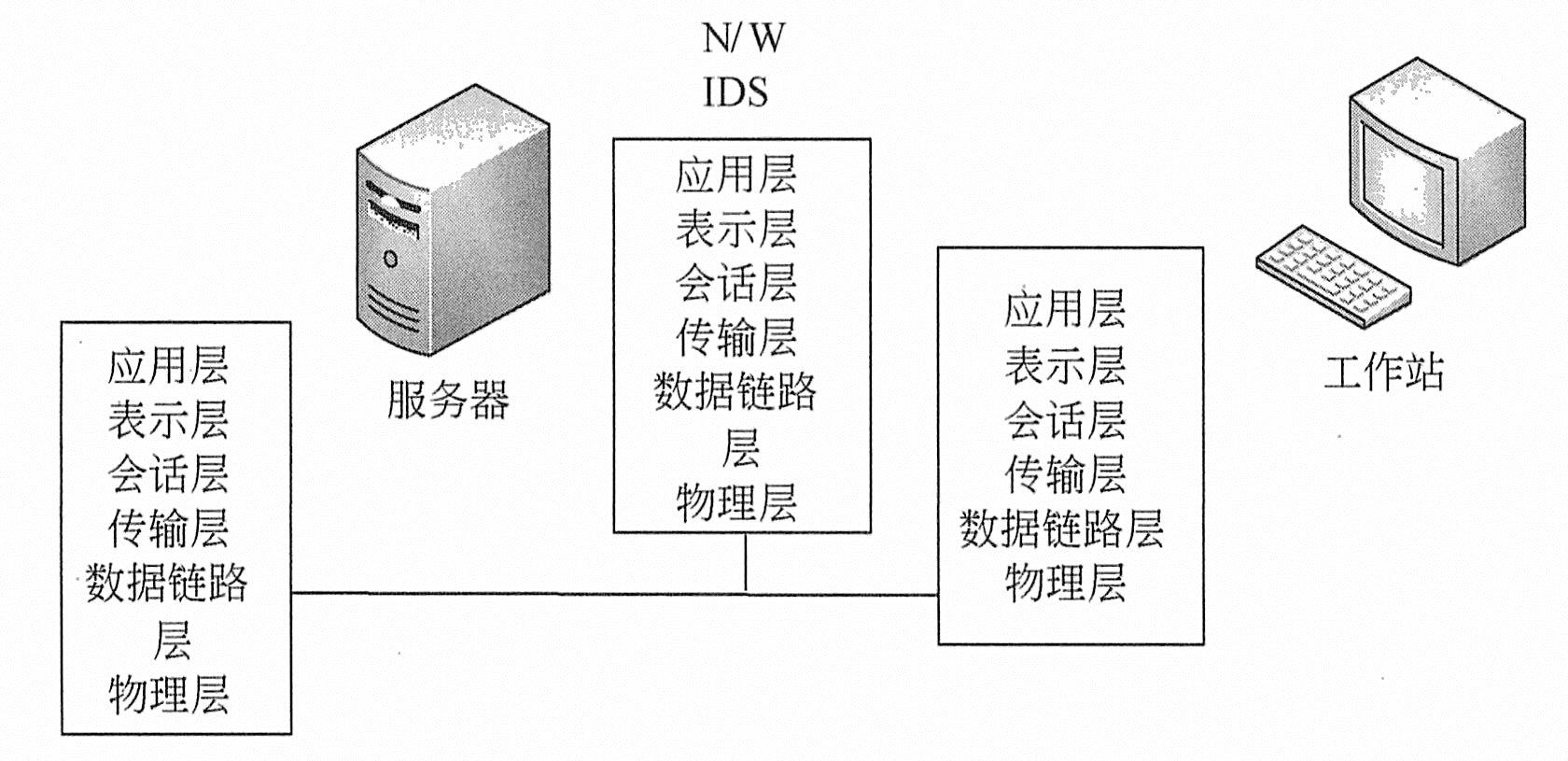 从下图可以看出,基于网络IDS位于客户端与服务端的通信链路中央,可以访问到通信链路的所有层次。因此这种IDS可以监视和检测网络层的攻击(如SYN洪流攻击)。