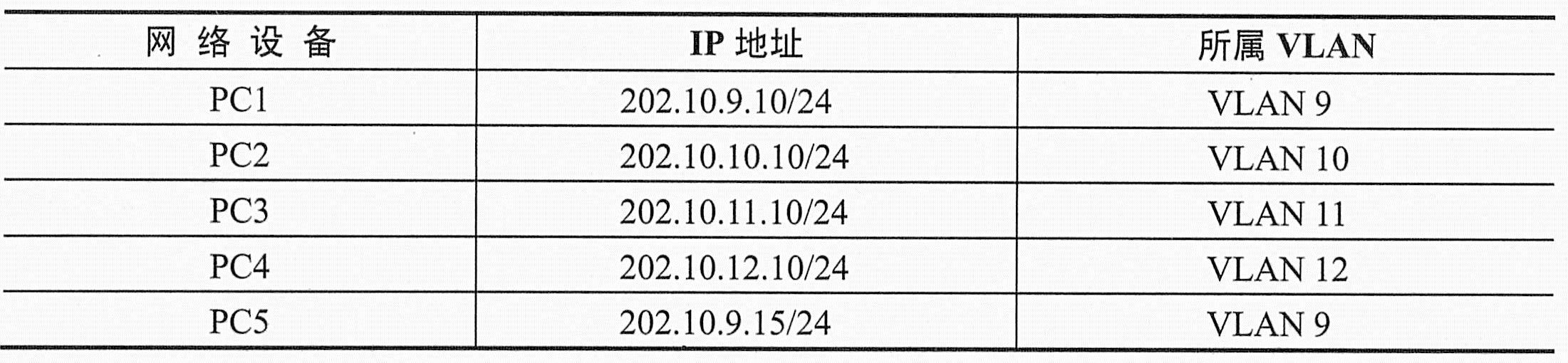 部分PC的IP信息及所属VLAN如下表所示。