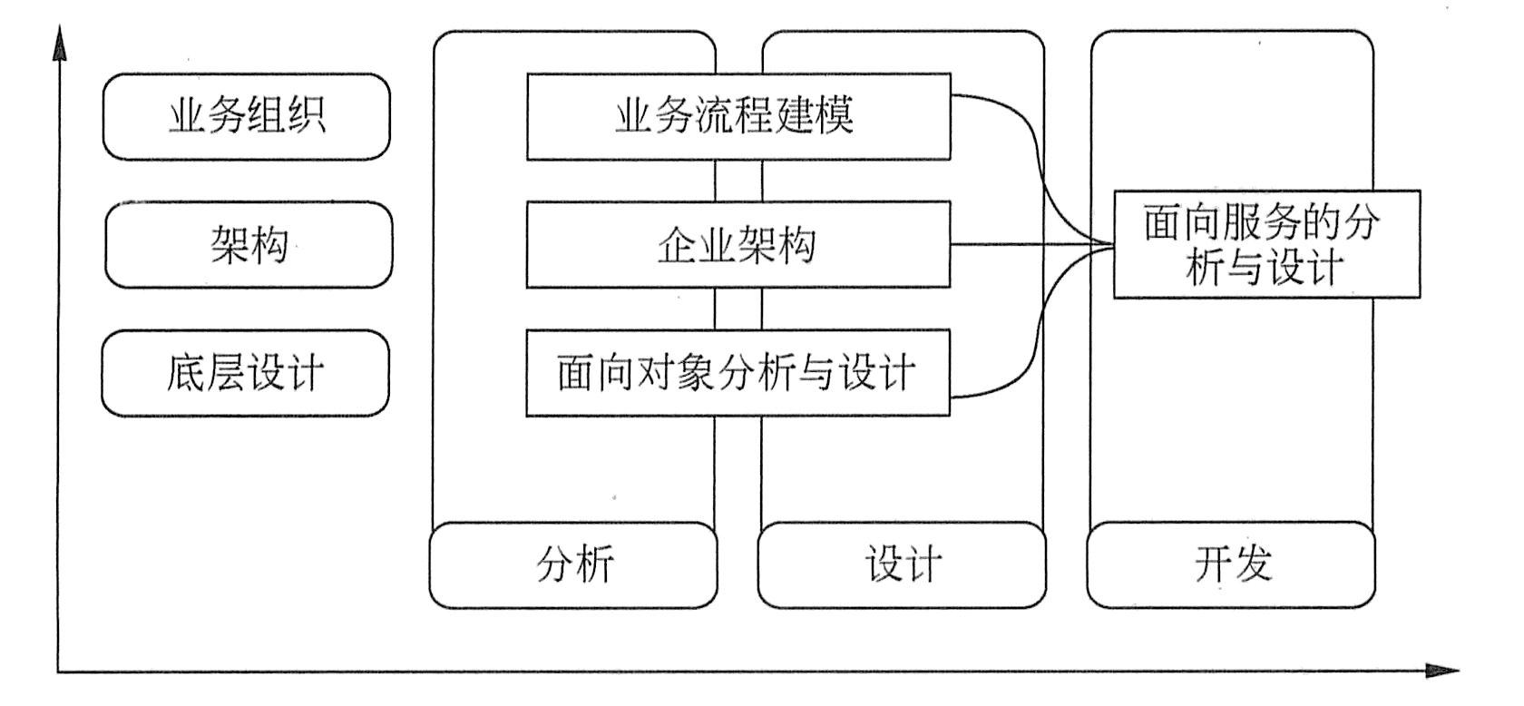 从建模的观点来看,SOA带来的主要挑战是如何描述设计良好的操作、服务和流程抽象的特征以及如何系统地构造它们。针对这个问题,Olaf Zimmermann和Pal Krogdahl综合了OOA、OOD、企业架构(Enterprise Architecture,EA)框架和业务流程建模(Business Process Modeling,BPM)中的适当原理,将这些规则中的原理与许多独特的新原理组合起来,提出了面向服务的分析与设计(Service-Oriented Analysis and Design,SOAD)的概念,OOAD、EA和BPM分别从基础设计层、应用结构层和业务组织层3个层次上为SOAD提供了理论支撑。其结构如下图所示。