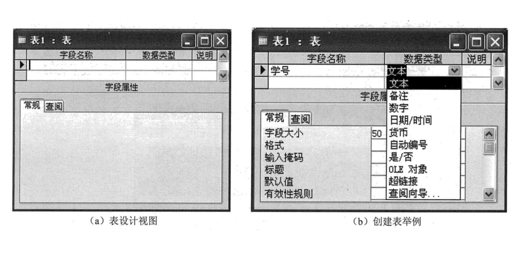 (3)单击设计器第一行“字段名称”,输入“学生”表的第一个字段名称“学号”,单击其右侧的下拉按钮,在弹出的下拉列表中提供可选的所有数据类型。如上图(b)所示。