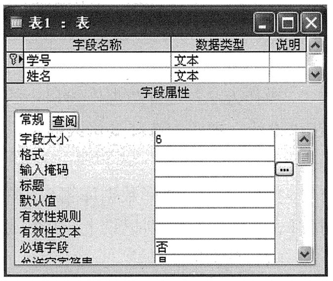 (6)定义主关键字。单击第一个字段的字段选定器,然后单击工具栏上的“主关键字”按钮(或右键单击,在弹出的快捷菜单中选择“主键”命令)。例如,下图所示表1中“学号”字段前有标识,表示“学号”已被定义为主关键字。