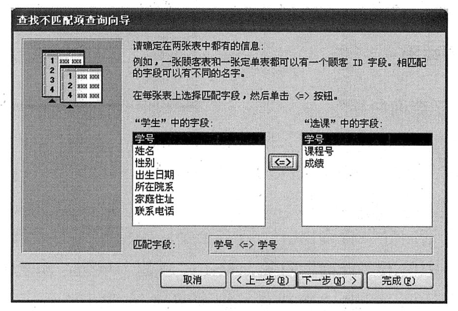 (4)确定两张表中都有的信息,在表中字段窗口里选择某个字段,然后在另一个表中选择某个字段。完成后,单击<=>按钮,在匹配字段里将显示匹配的字段。下图所示的“学生”表中的“学号”字段与“选课”表中的“学号”字段被设置为“匹配字段”,这两个字段的数据类型必须是相同的。