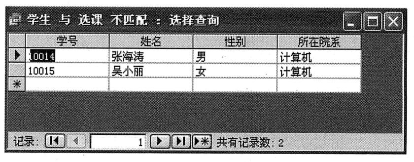 使用“查找不匹配查询向导”是将一个表中的某个字段的数据和另一个表中的某个字段的相同记录删除,并存储在另一张表里。例如,查询“教学”数据库中没有选课学生的学号、姓名、性别和所在院系。具体操作步骤如下: