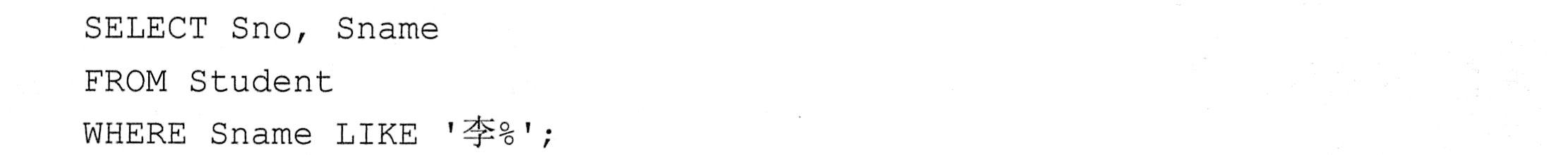 在WHERE子句的条件表达式中可以使用算术比较运算符号,对于字符型数据,可以使用LIKE关键词以及通配符。例如,要查找姓李的学生的学号和姓名的SQL语句如下: